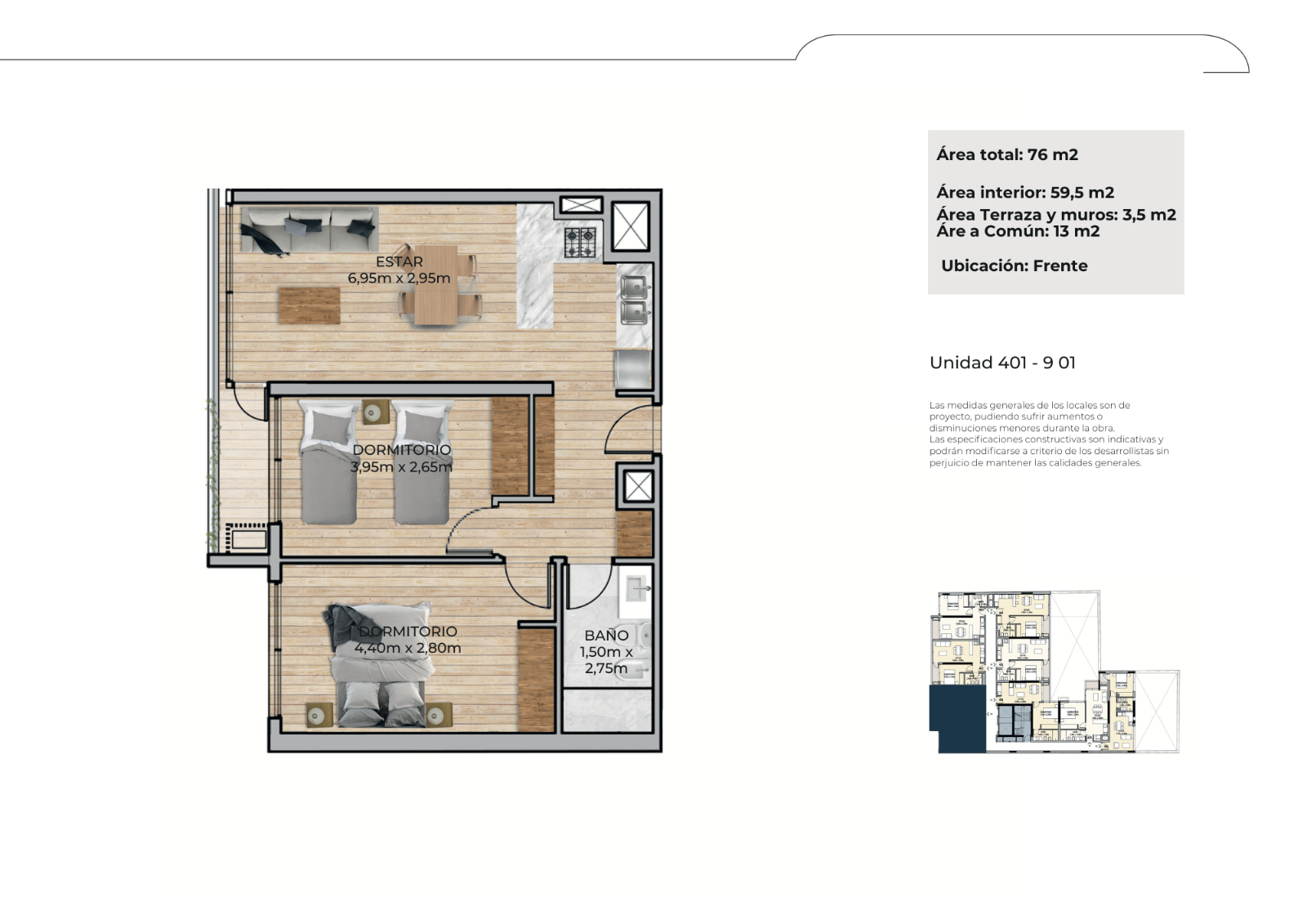 * Pavimento porcelanato de primera calidad.